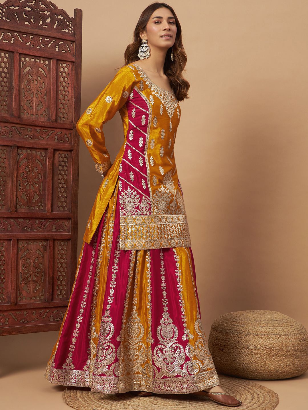Yellow & Gold-Toned embroidered kurta , has a round neck, long Sleeves slip-on closure