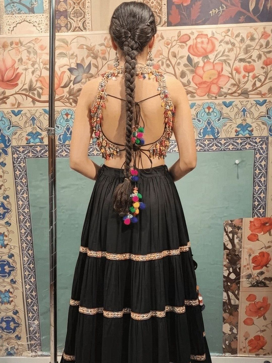 Black and yellow embroidered ready to wear blouse, has a v-neck, short sleeves, black and yellow embroidered ready to wear lehenga, flared hem