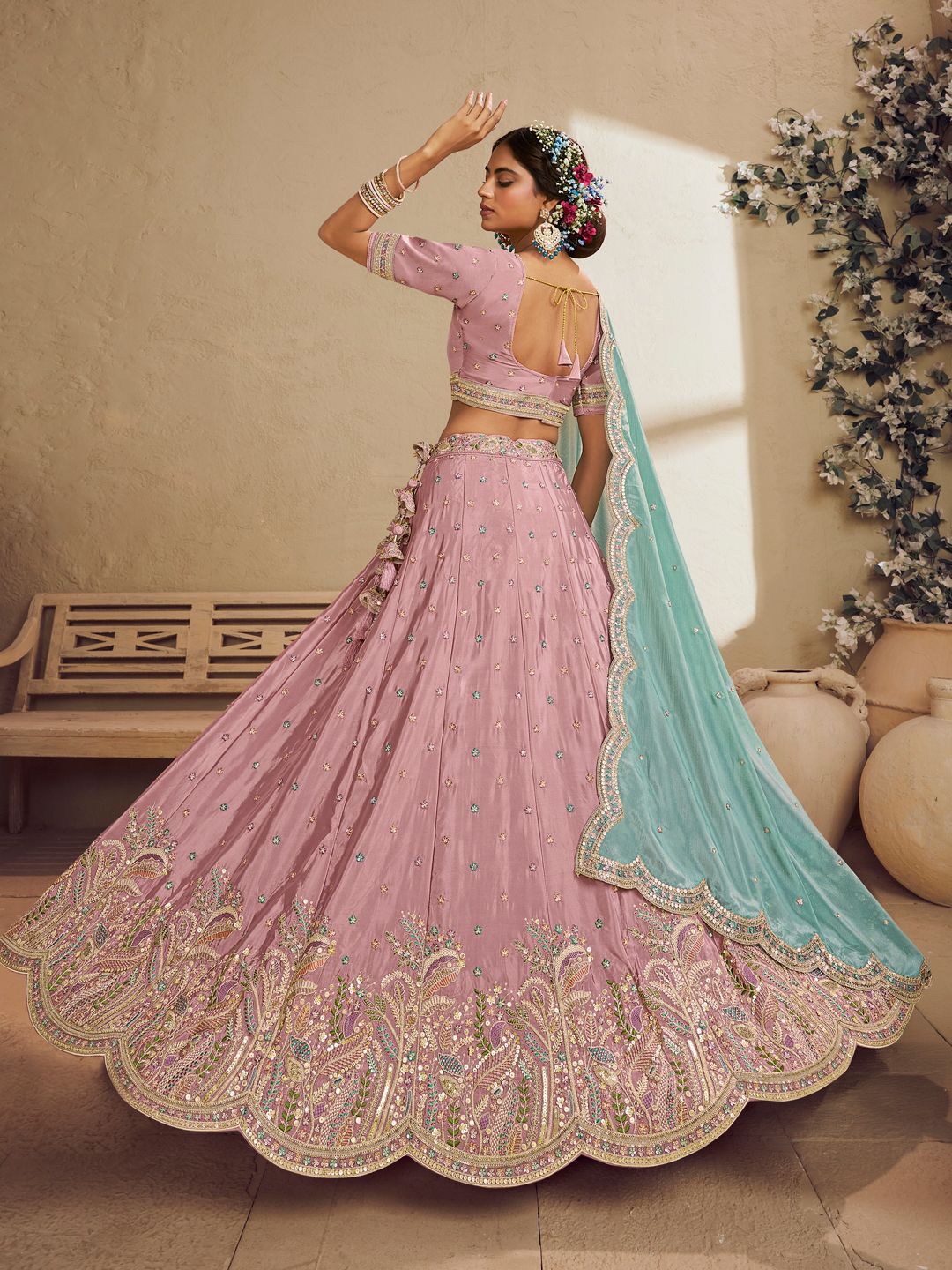 Pink and blue, gold-toned embroidered lehenga choli with dupatta, sequinned