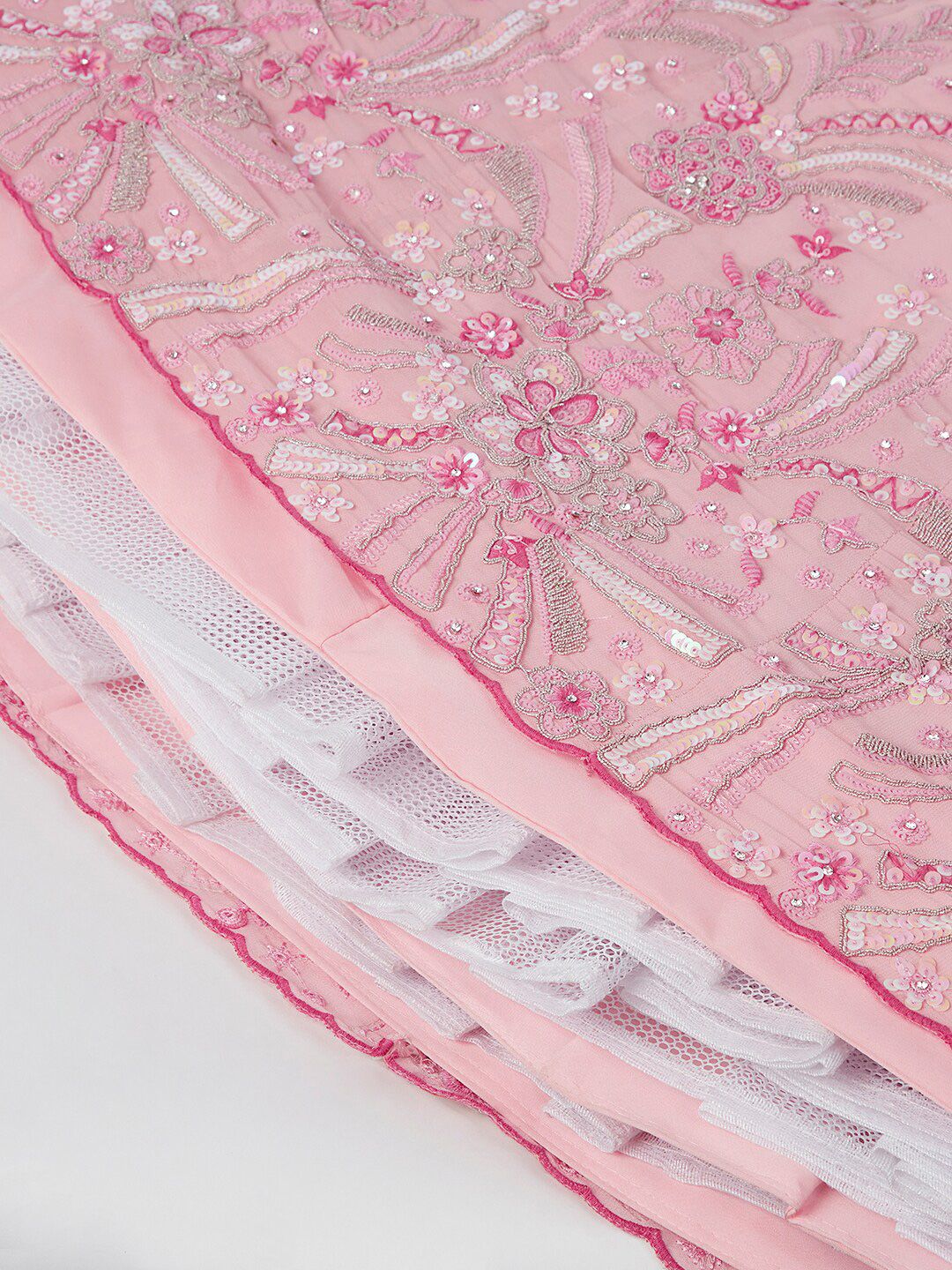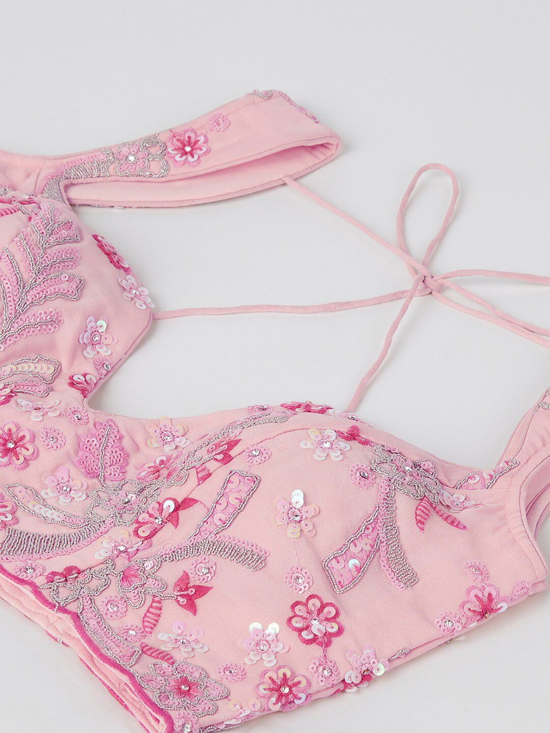 Pink embroidered unstitched blouse, has a round neck, three-quarter sleeves, pink embroidered semi-stitched lehenga, flared hem