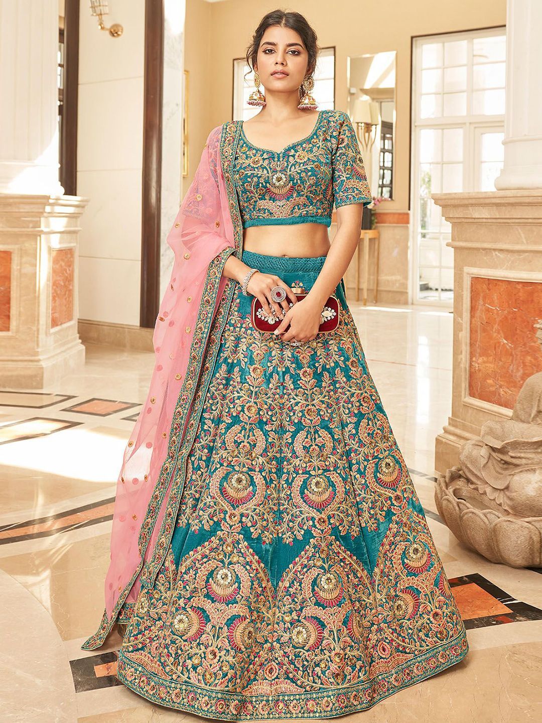 Teal and pink embroidered lehenga choli with dupatta, sequinned