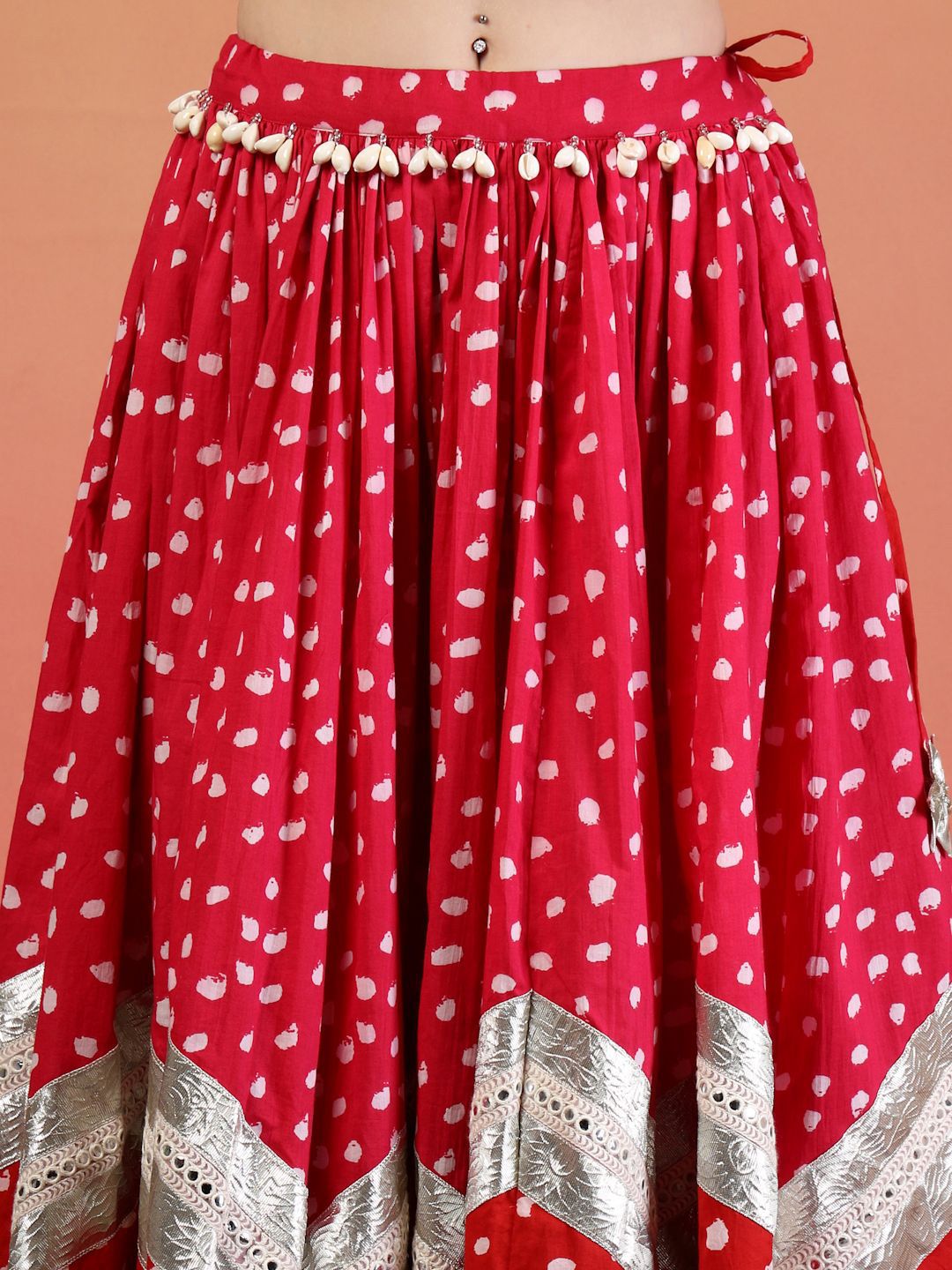 Red printed ready to wear lehenga, has drawstring closure, flared hem