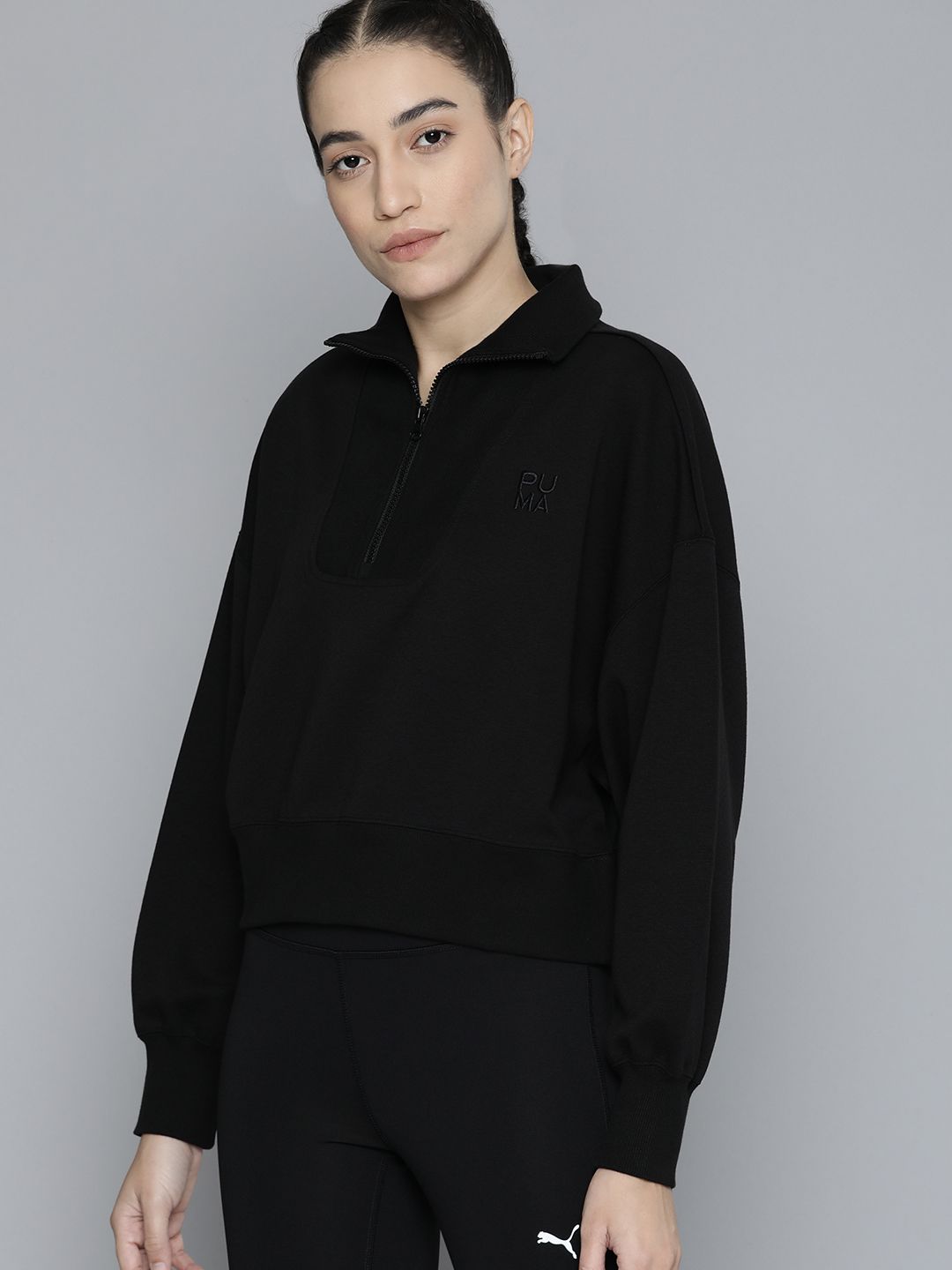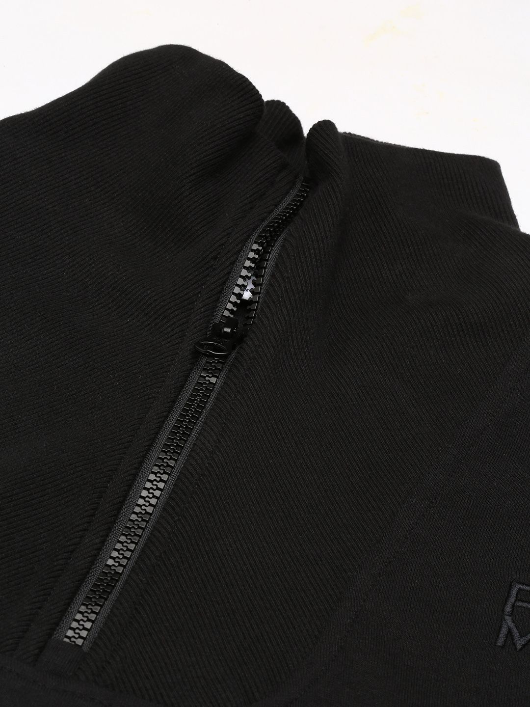 - Black solid sweatshirt has a high neck, long sleeves, half zipper closure, ribbed hem