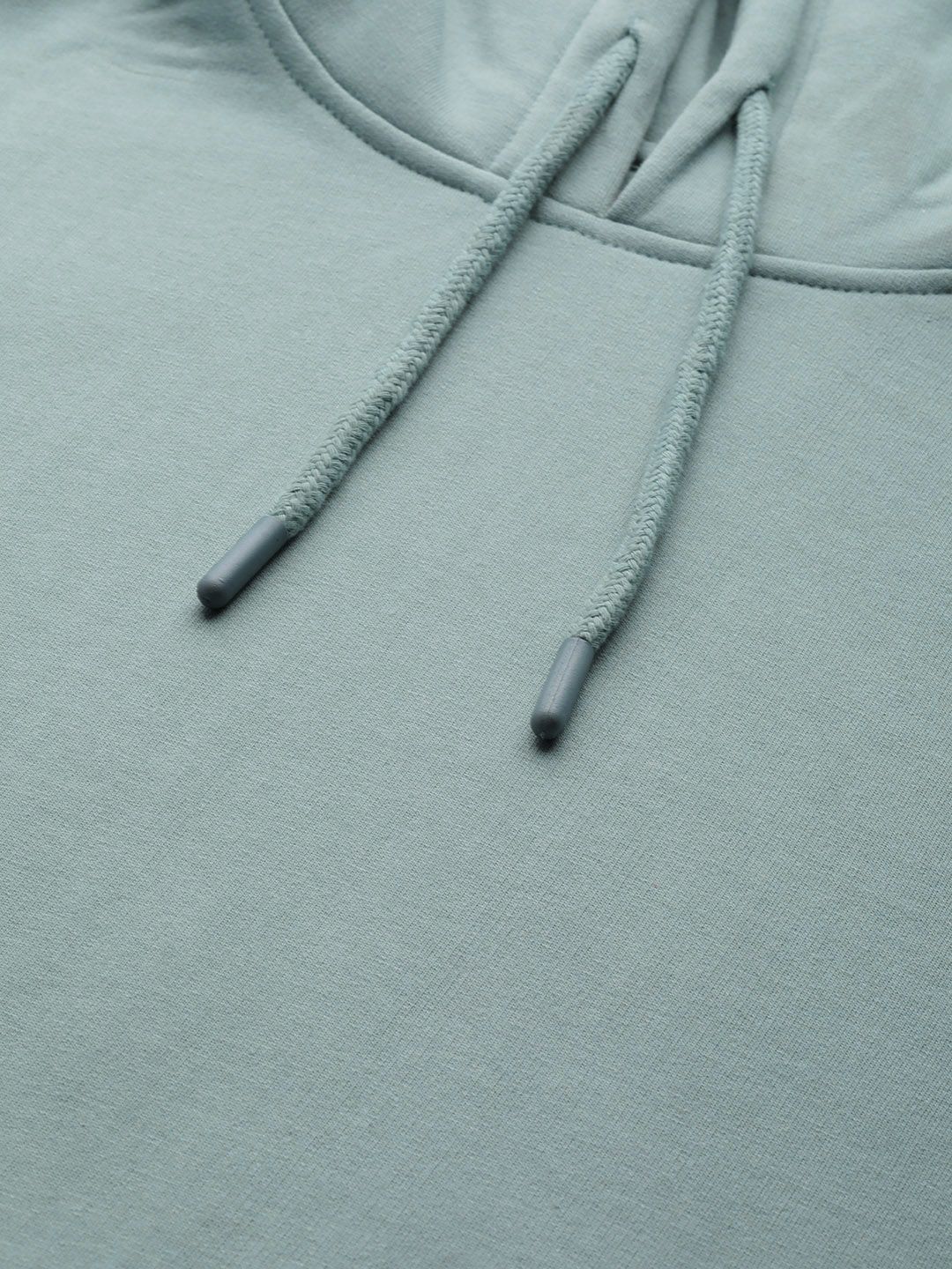 Green solid sweatshirt, has a hood, one kangaroo pocket, long sleeves, straight hem