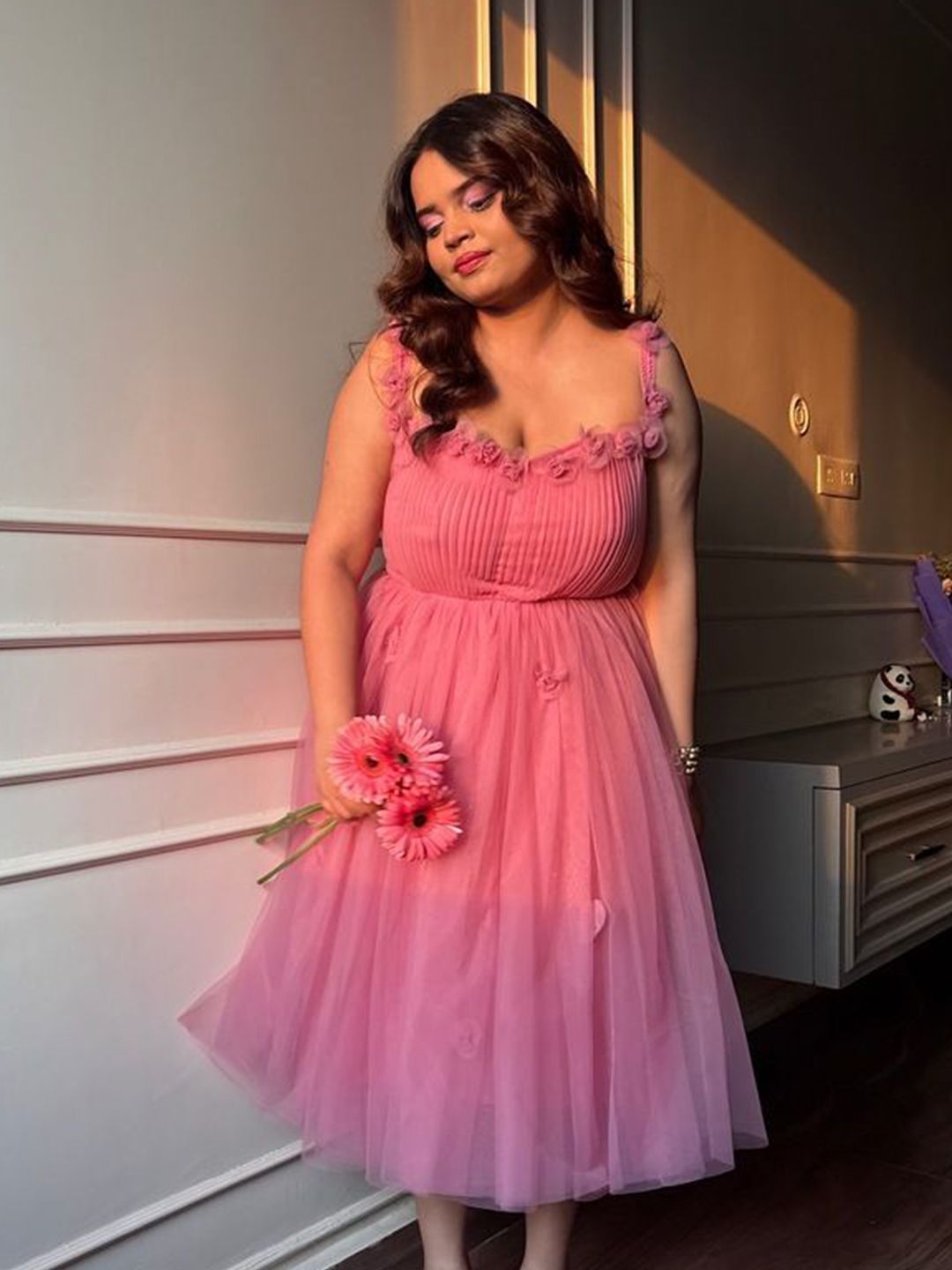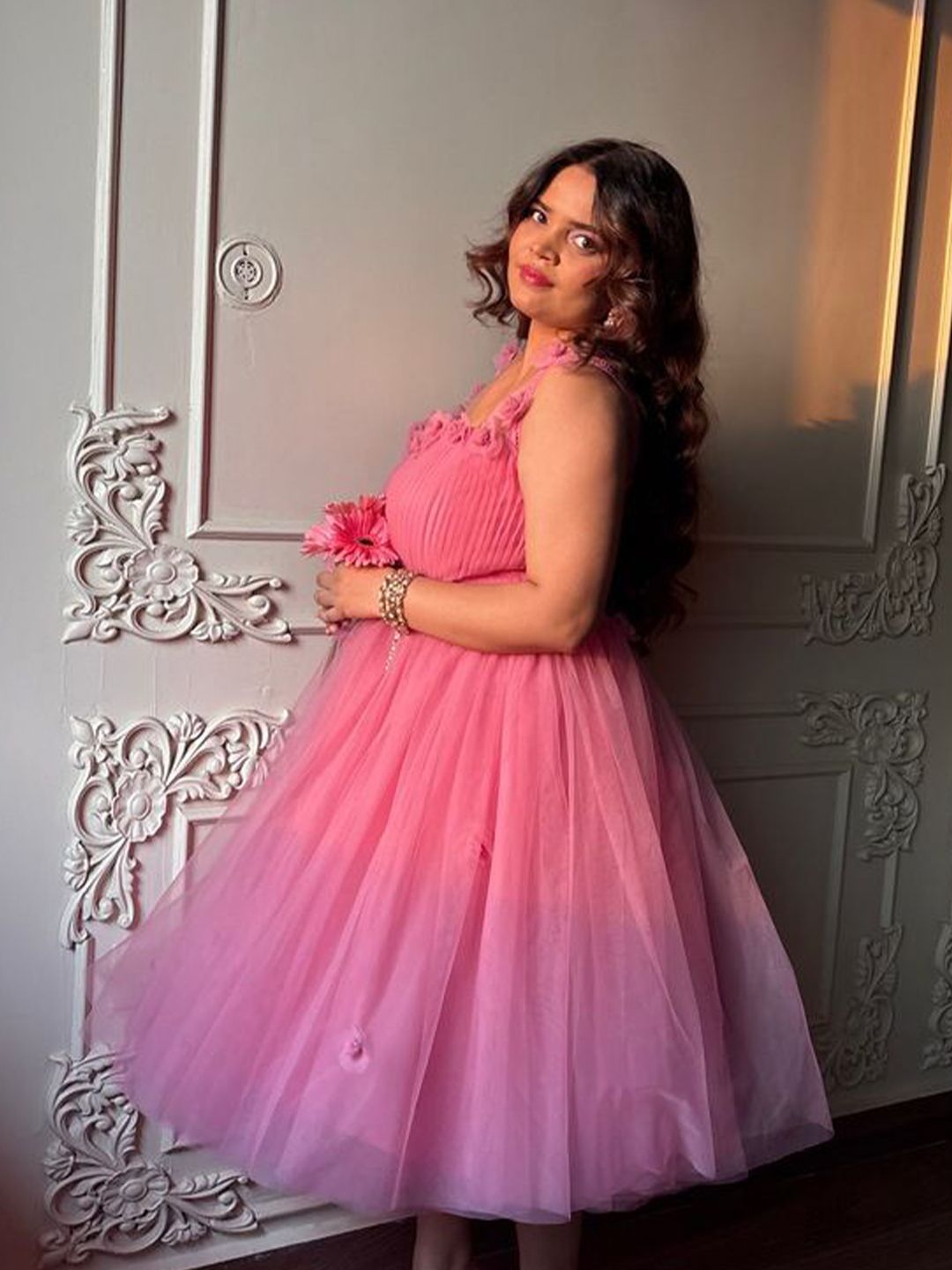 - Pink solid fit and flare dress